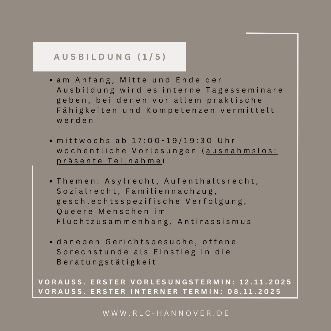 Wichtig! Ab diesem Wintersemester gibt es neben der Ausbildung zur Berater*in bei der RLC Hannover auch die Möglichkeit, sich fortbilden zu lassen. Dieses Angebot richtet sich an alle, die bereits Berührungspunkte mit dem Asyl- und Aufenthaltsrecht hatten und ihr Engagement/ihre Tätigkeit nicht als Berater*in bei der RLC Hannover einbringen wollen. Für weitere Infos zu dieser Möglichkeit siehe hier: Fortbildung im Asyl- und Aufenthaltsrecht